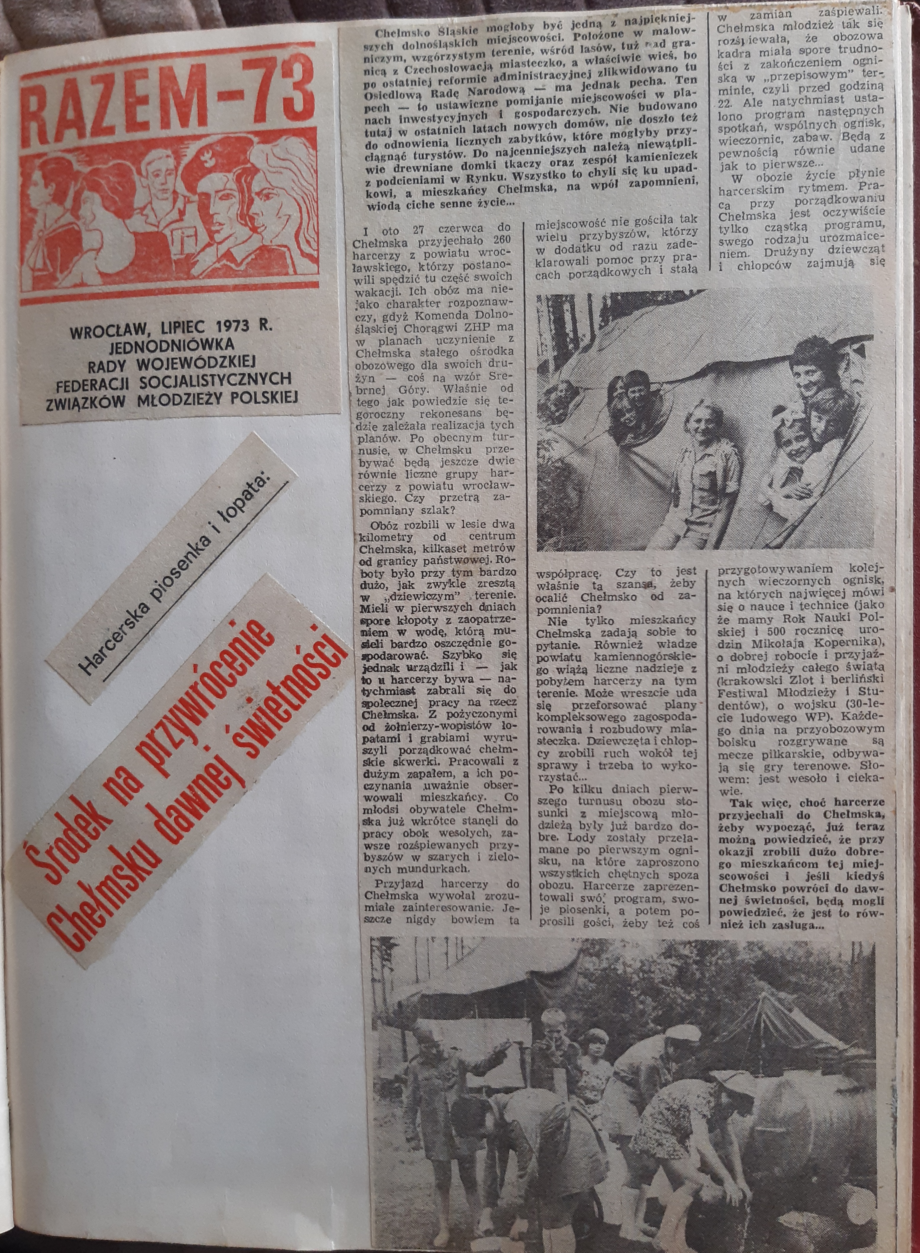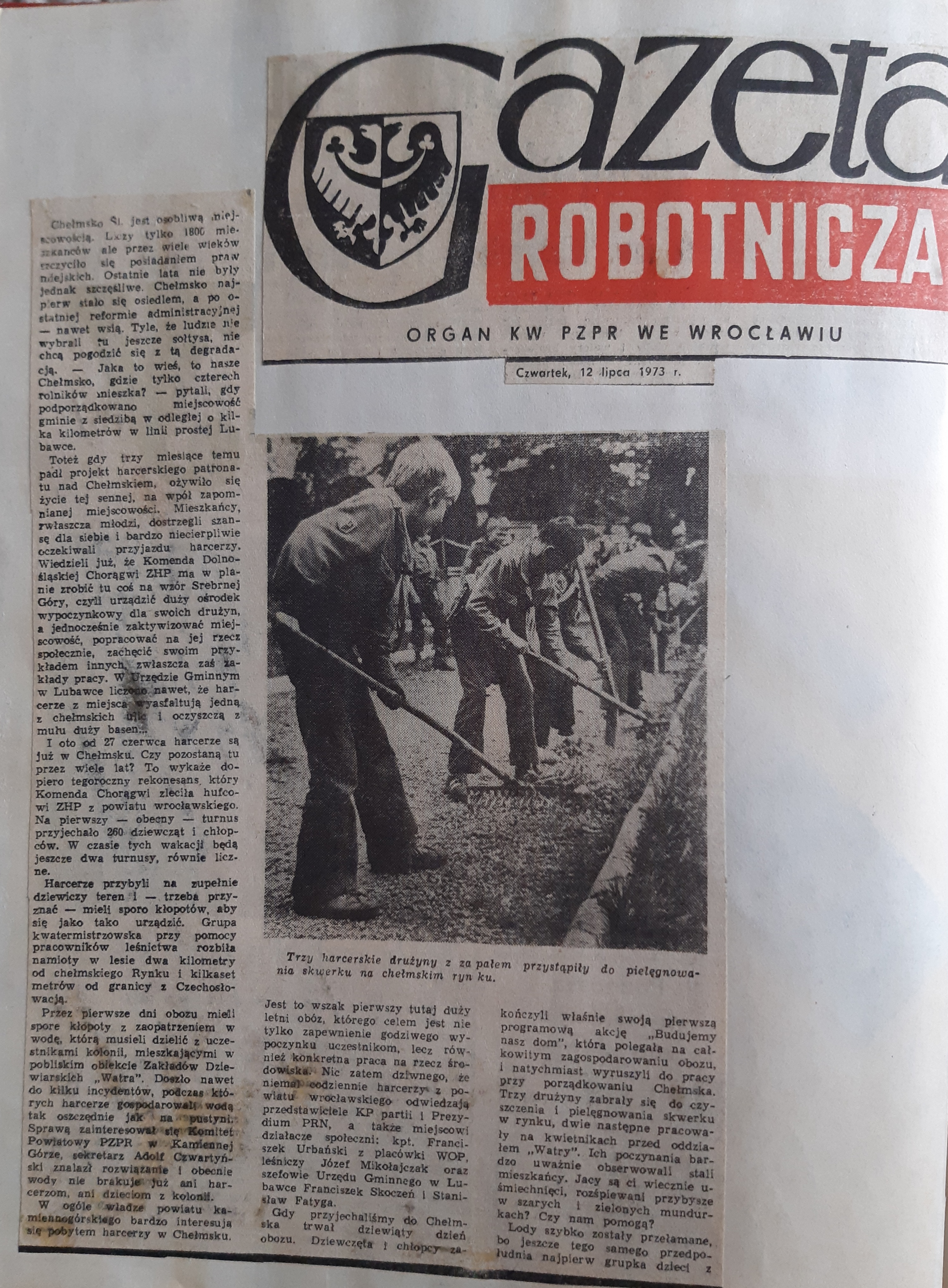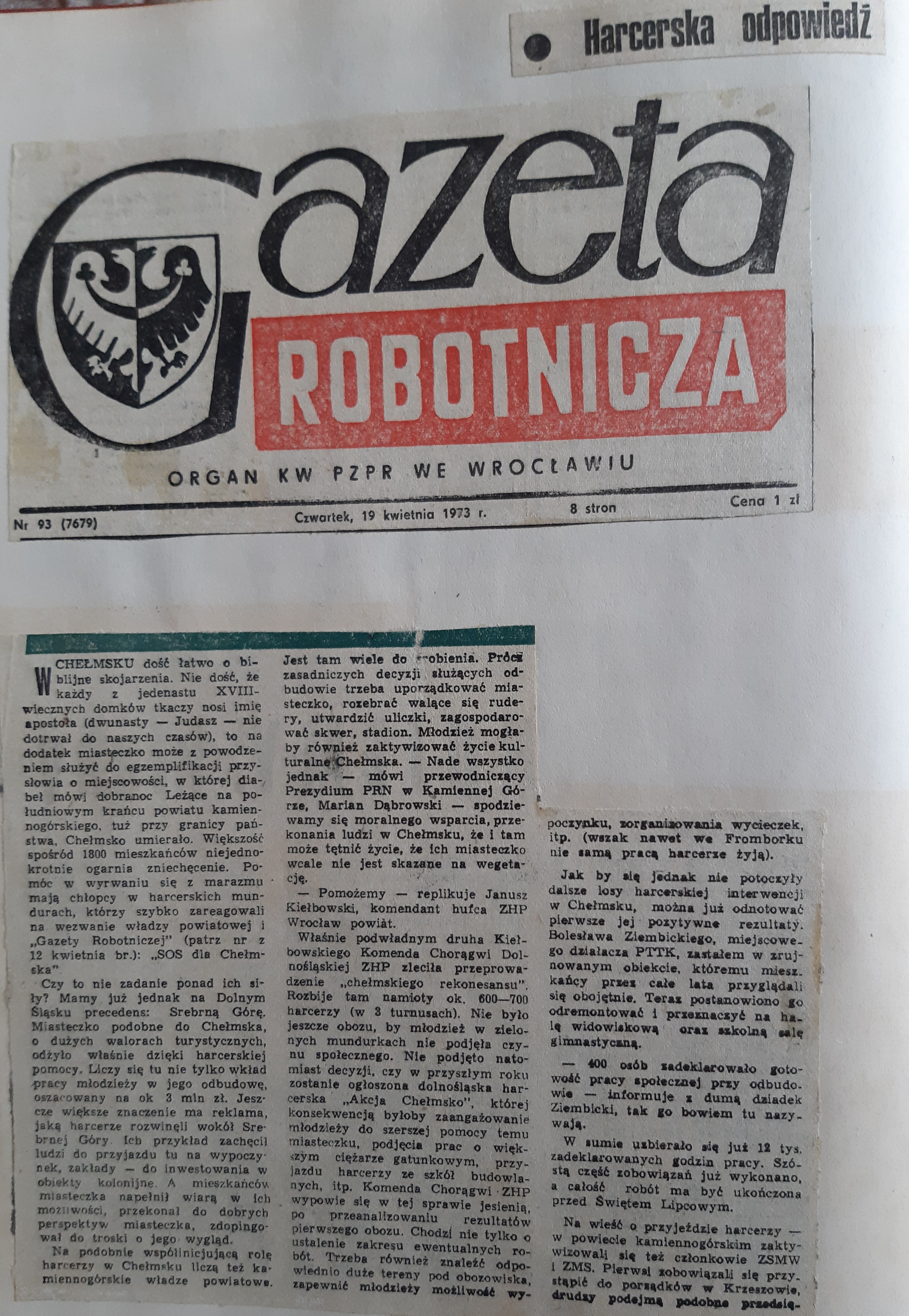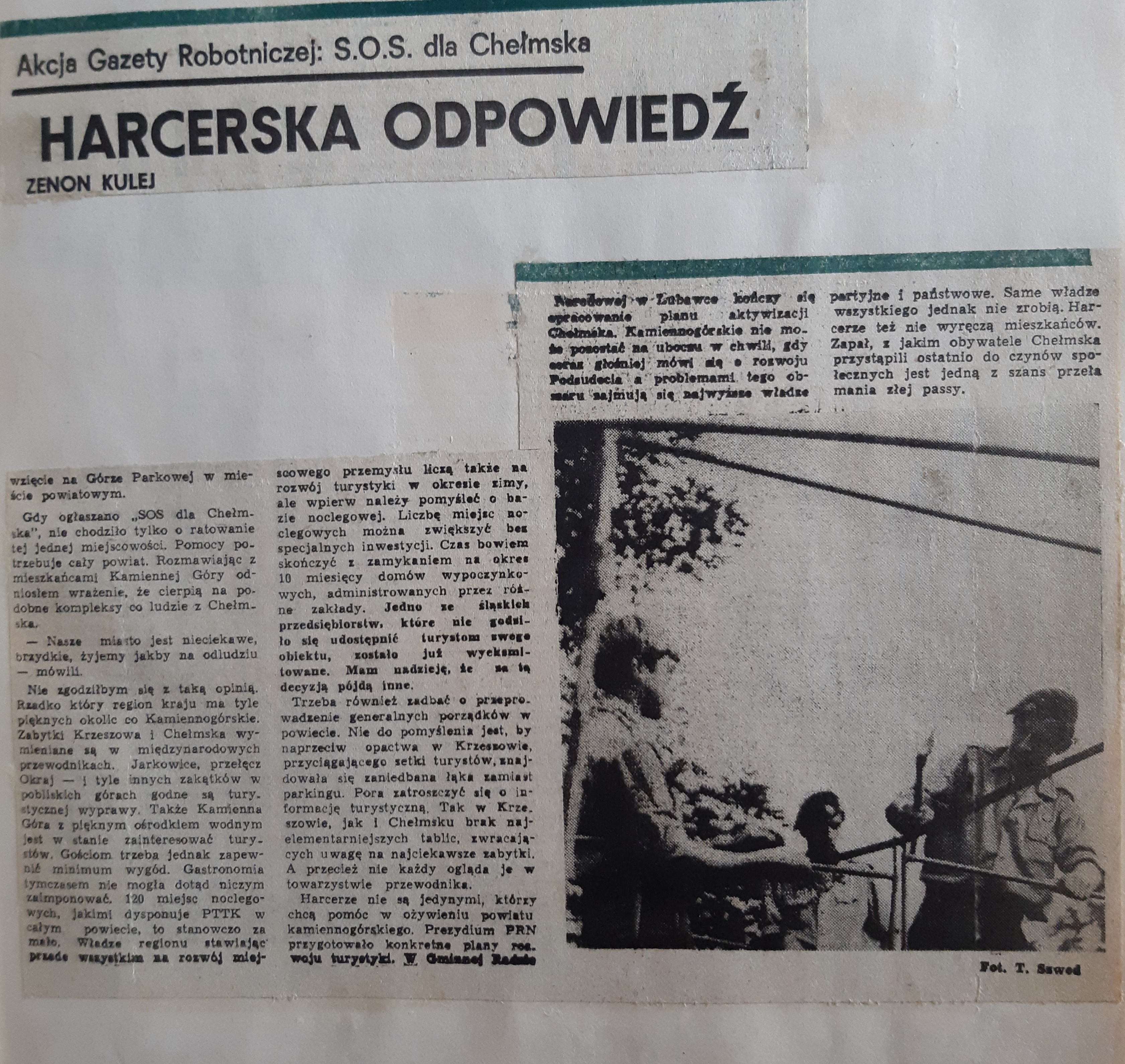 Dzisiaj trafiły do moich zbiorów ciekawe wycinki prasowe z historii mojego macierzystego hufca "Wrocław Powiat".Fakt nieco już przypruszone siwizną jak ja.Wczesne lata siedemdziesiąte a nawet wcześniej.Dużo informacji związanych z naszą okolicą- kolejna a raczej wcześniejsza akcja harcerzy mająca na celu wsparcie Chełmska malowniczej i zapomnianej miejscowości koło Kamiennej Góry.Dzisiaj znanej już choć małej miejscowości turystycznej z 12 apostołami.Tam rozpoczynałem swoją pracę instruktorską początkowo jako pomocnik kwatermistrza nazywany potocznie "drobnym kwatermistrzem",potem drużynowy i oboźny.Ale o tym pisałem już wcześniej w swojej historii.Sporo informacji prasowych o wypoczynku dzieci i młodzieży,jej zaangażowaniu i społecznym działaniu oraz jedynym możliwym zorganizowanym wypoczynku.W tej złotej księdze był też wpis z nadania sztandaru mojemu hufcowi- wpis odręczny oraz autografy darczyńców.