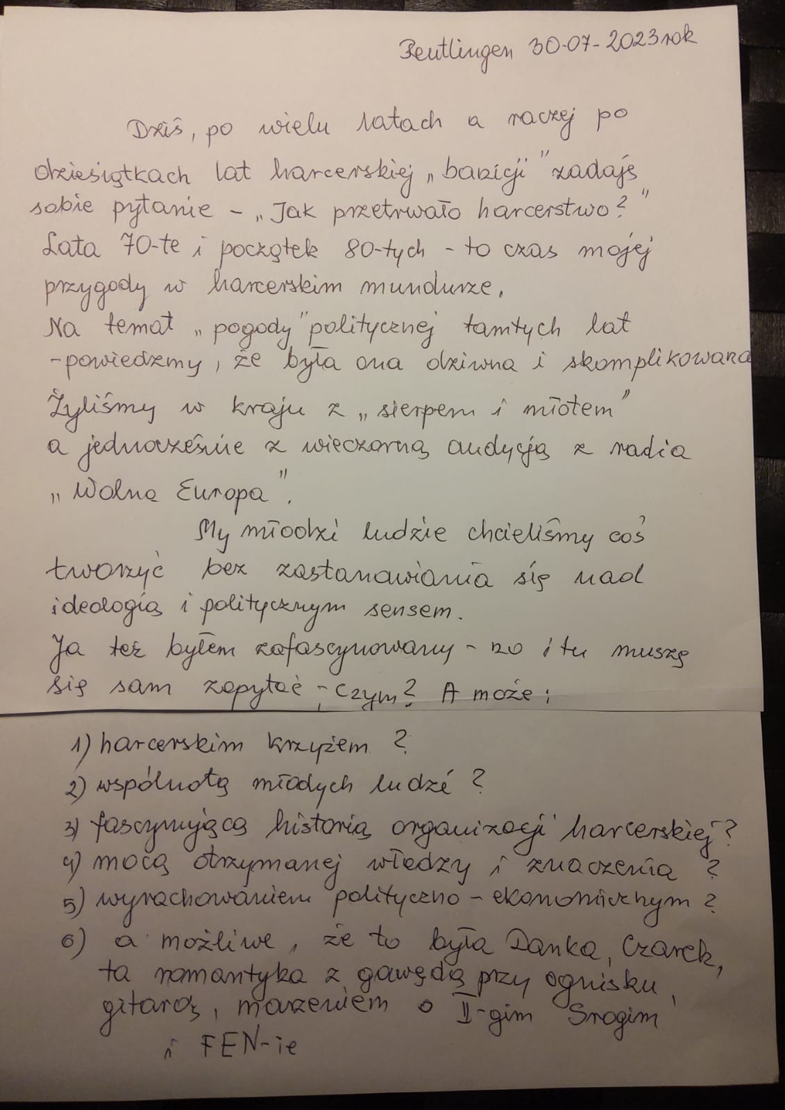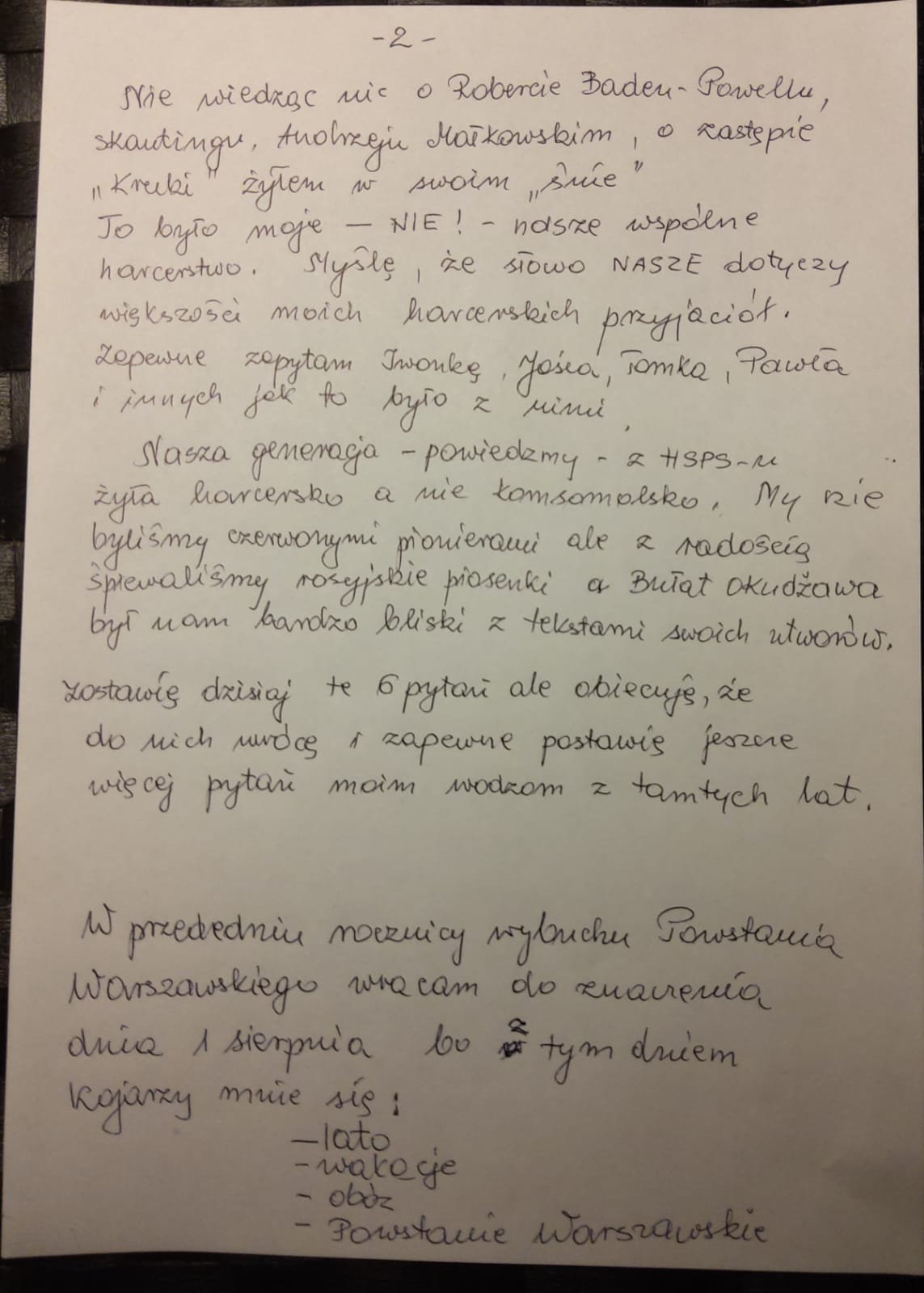 Tekst nawiązuje do historii ZHP w PRL, początkach działalności Sławka w harcerstwie,jego spojrzeniu na rzeczywistość.I teraz po powrocie a raczej odwiedzinach w nowej rzeczywistości Sławek wraca do przyjaciół i obserwuje oraz ocenia powrót do starego przedwojennego harcerstwa które propagował w końcówce lat siedemdziesiątych w FEN.Można się z nim zgadzać lub nie,każdy ma takie prawo.Ja żyłem w PRL,prowadziłem drużynę harcerską,szczep,krąg instruktorski,pracowałem etatowo w hufcu Jelenia Góra.Moje korzenie sięgają pracy w hufcu Wrocław Powiat gdzie miałem znakomite wzorce osobowe i niezależnie od poglądów politycznych i wyznaniowych uczyliśmy innych tolerancji i zaangażowania.Oni też przekazywali swoją wiedzę o historii ZHP przed wojną i czerpali z niej wiedzę i pozytywne wartości czego i Wam życzę.Poniżej tekst Sławka i zaproszenie do dyskusji w tak ważnym dniu -rocznicy wybuchu powstania Warszawskiego.