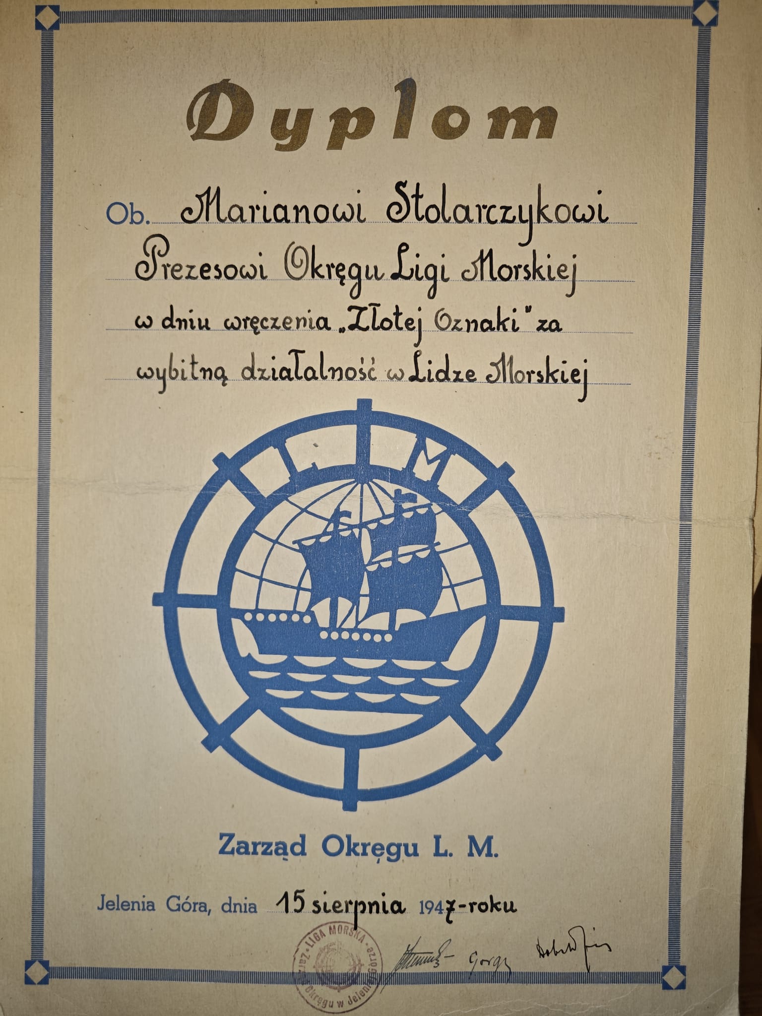 We wtorek 18 marca otrzymałem ciekawy podarek od wnuka dh.Stolarczyka -  Daniela .Historia  dh. Mariana Stolarczyka opisana jest w wielu naszych publikacjach ale tych fotek jeszcze nie miałem.Liga Morska rozpoczęła działalność w naszym mieście .