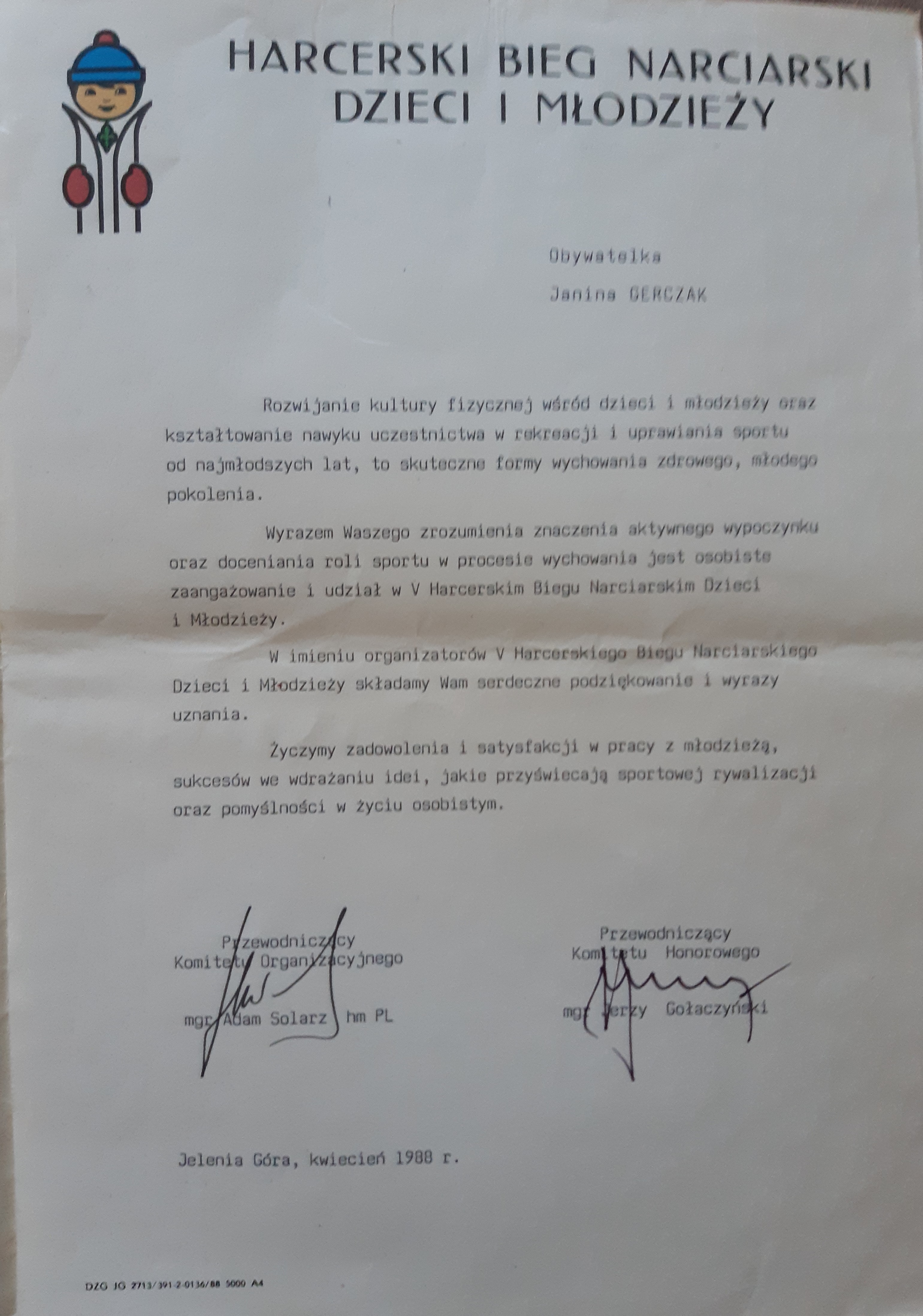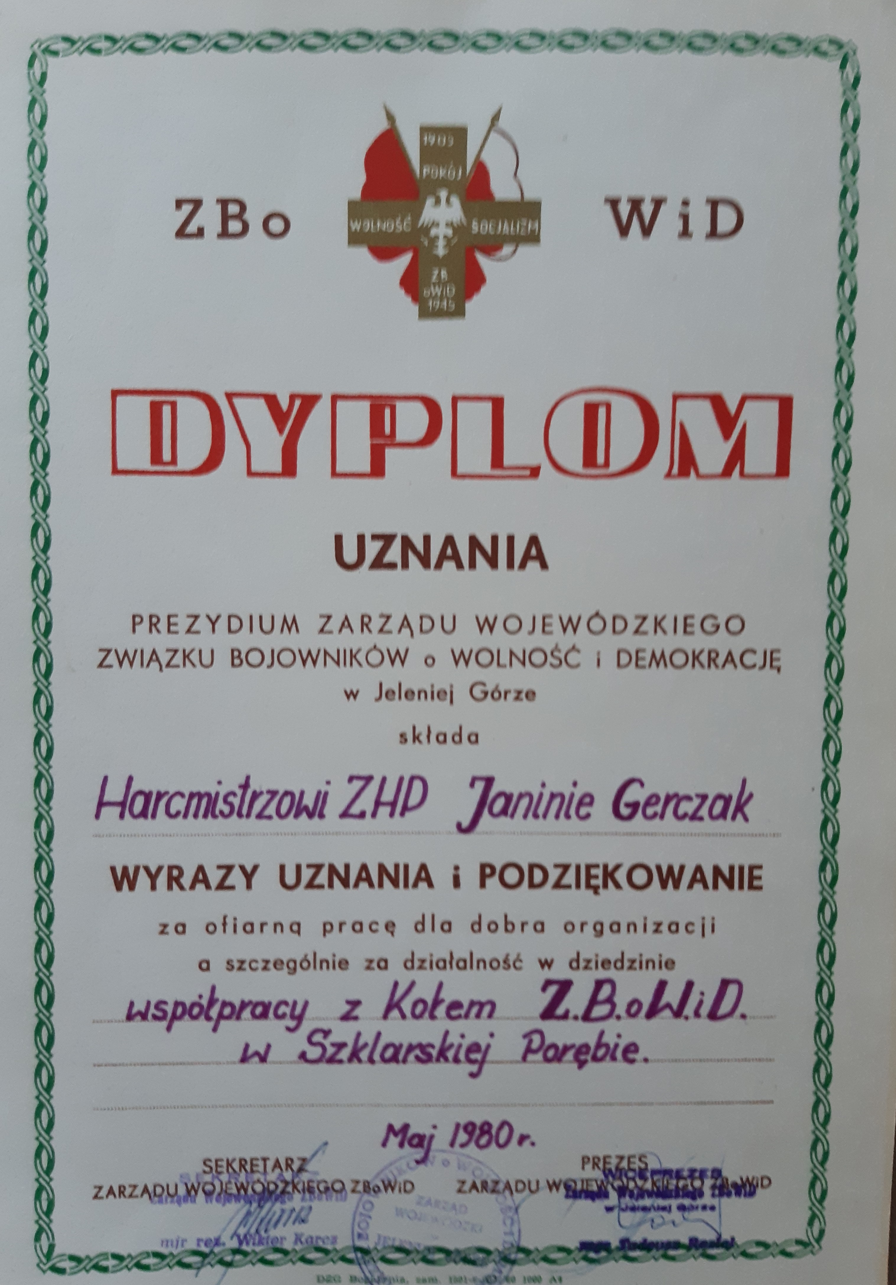 Hm.Pl Gierczak Janina,instruktor w Hufcu ZHP Szklarska Poręba.Od 1.09.1975 do 10.11.1982 i od 16.04.1984 do 1.12.1986 była komendantem Hufca,a od 18.01.1855 do 18.01.1989 wchodziła w skład Komisji Instruktorskiej Chorągwi Jeleniogórskiej.W 1881 r odznaczona krzyżem "Za Zasługi dla ZHP"(na foto.po lewej stronie.Zawsze uśmiechnięta i radosna.