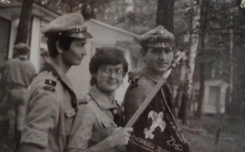 Tu radosna i szczęśliwa dh.Danuta z harcerkami z Lwówka. Ewa z proporcem