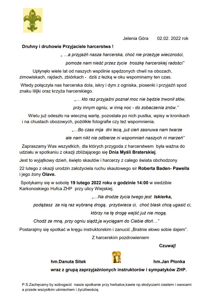 19lutego 2022r w siedzibie Karkonoskiego Hufca ZHP z inicjatywy dh.Danuty Sitek oraz dh.Jana Płonki odbyło się spotkanie instruktorów seniorów.