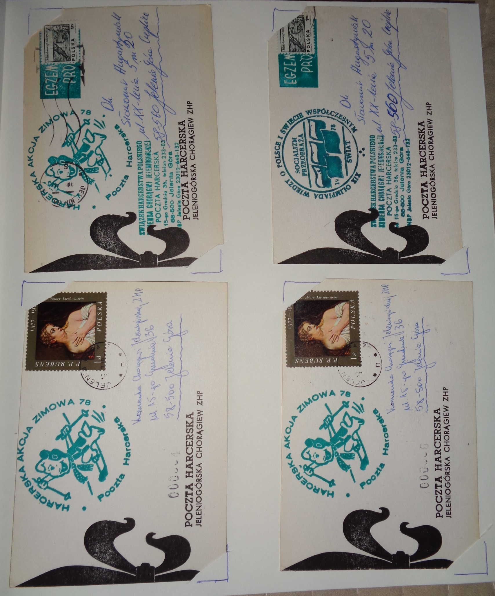 Postanowiłem podzielić się kilkoma stronami kart i kopert z moich zbiorów dokumentujących po trosze harcerską pocztę Chorągwi Jeleniogórskiej ( taka była w historii naszego harcerstwa) oraz innymi które udało mi się zebrać.Poszukuję innych których jeszcze nie mam a podwójnymi chętnie się podzielę- wymienię.Harcerską pocztę naszej chorągwi tworzyli min.Janusz Milewski i Cezary Wiklik.O tym jak to się działo możecie poczytać na naszej stronie w wielu tekstach.Zbiór powstał z darów braci instruktorskiej.Album czeka na kolejne kartki i koperty- poszukajcie w szufladach.