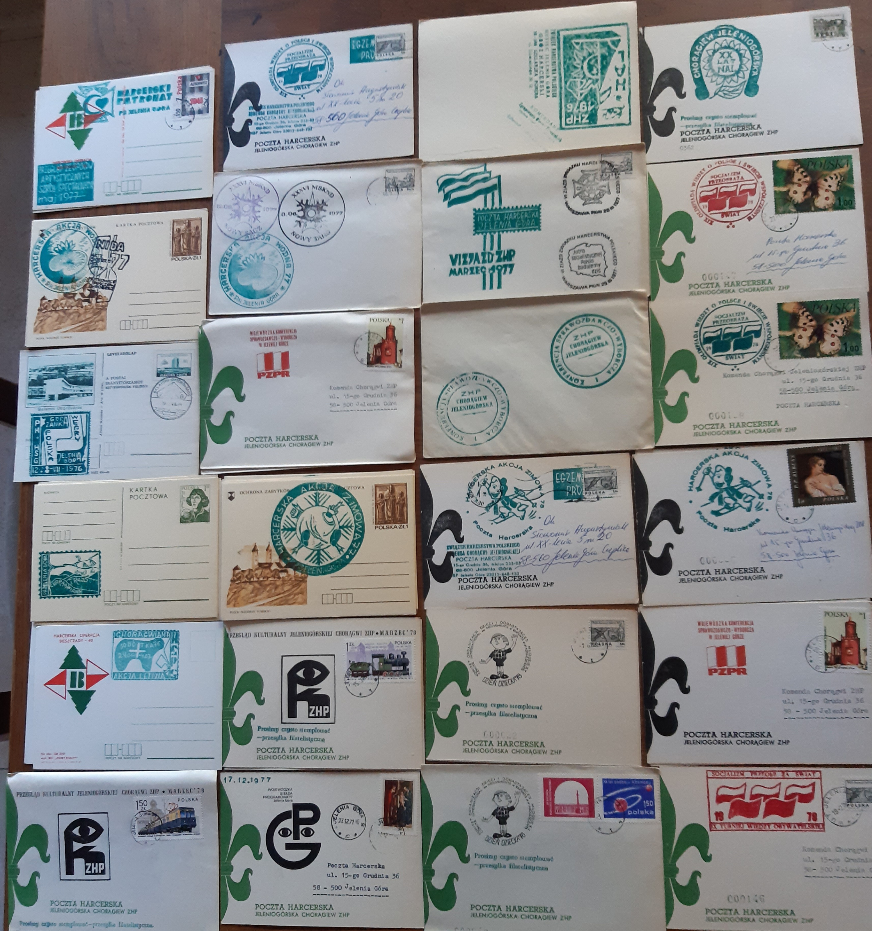 Te piękne koperty dostałem od Sławka Augustyniaka.Dzieło instruktorów Chorągwi Jeleniogórskiej okresu 1974-80.Dziękuję.Niektóre mam w kilku egzemplarzach -chętnie wymienię na inne z naszego terenu.Warto ocalić od zapomnienia.